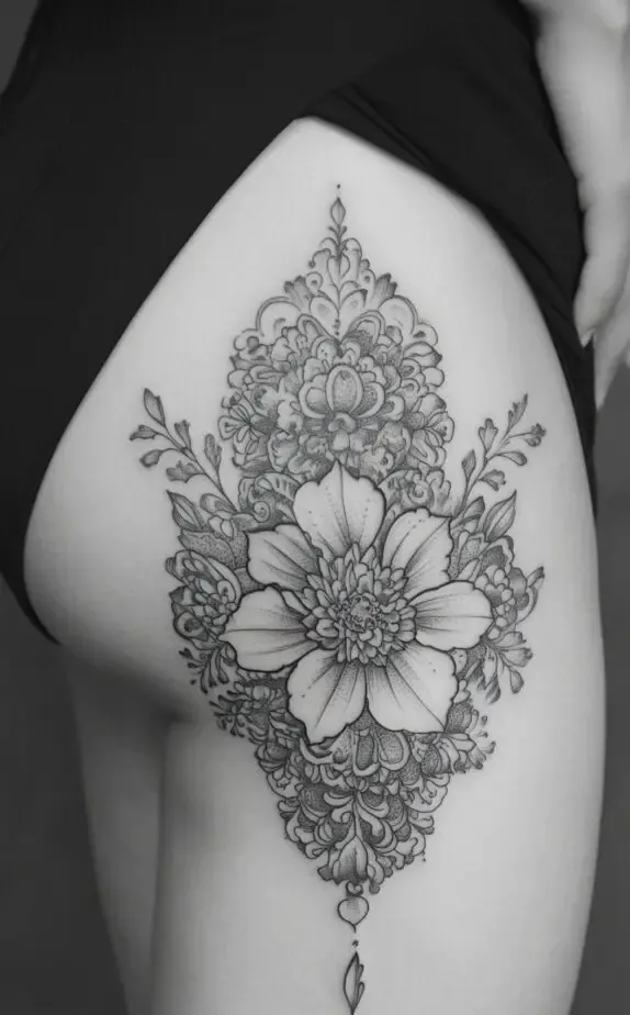 This intricate mandala-inspired tattoo blends floral elements with geometric patterns. The symmetry of the design draws the eye, creating a mesmerizing effect. The placement on the hip accentuates the curves, making it both sensual and sophisticated.