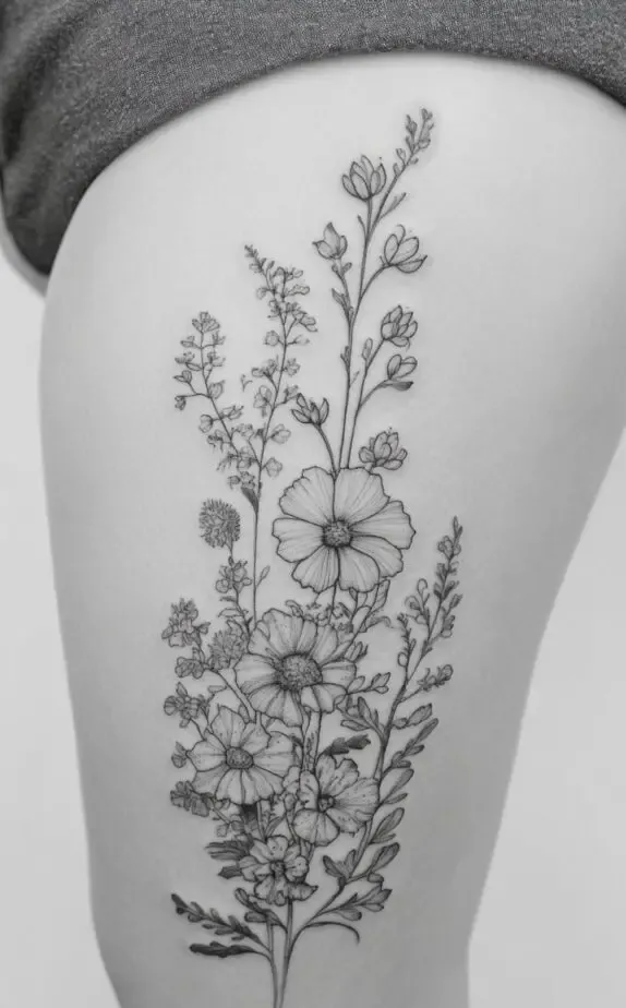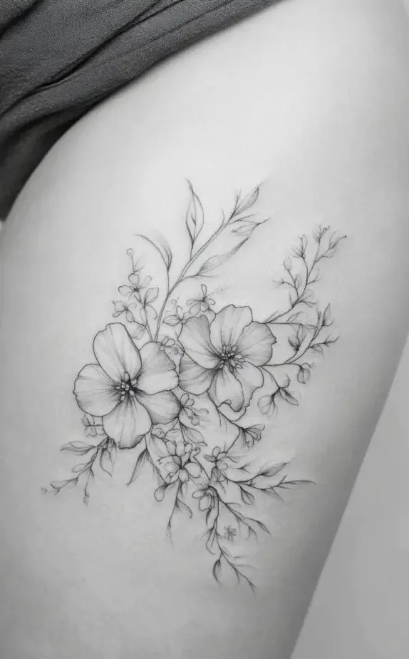 This tattoo is a fine-lined botanical piece, combining various flowers and leaves into a cohesive design. Each element is delicately shaded, making it appear like a drawing that has come to life on the skin. The arrangement follows the natural line of the hip, adding a touch of elegance.