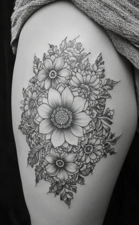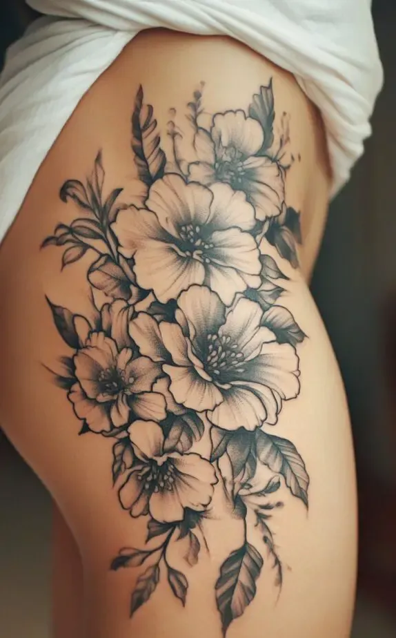 This hip tattoo presents a cluster of bold, intricate flowers, each petal and leaf meticulously shaded to bring depth and realism. The arrangement flows organically, complementing the curve of the hip, adding a sense of movement to the design. Large, central blooms stand out, surrounded by smaller buds and foliage that soften the overall look.