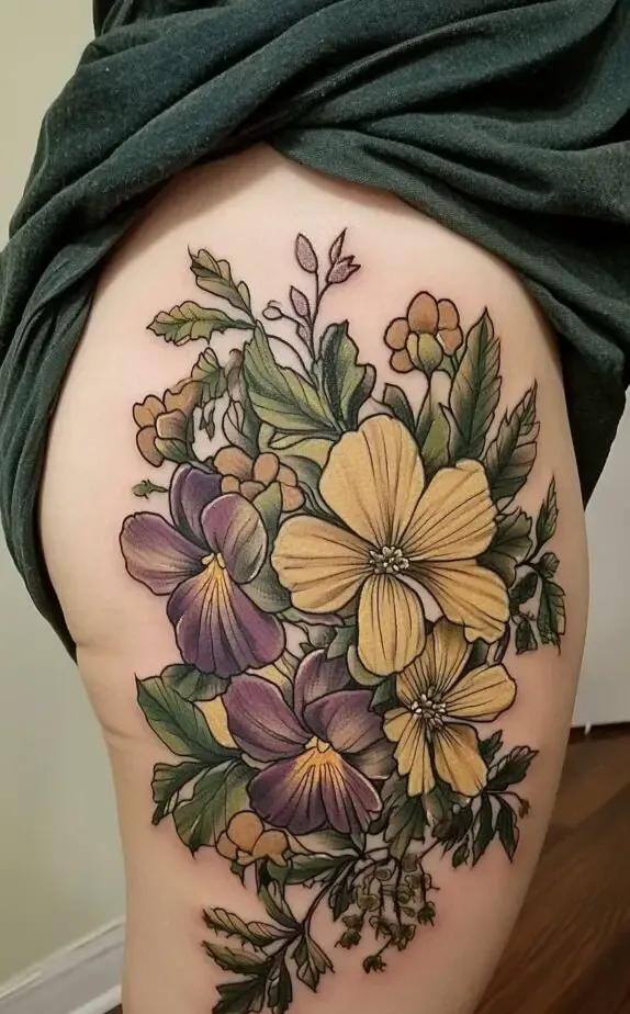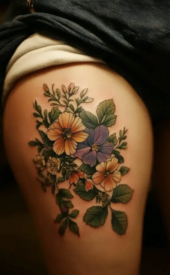 In this colorful design, blossoms of various hues blend harmoniously to create a captivating hip tattoo. The vibrant colors bring a lively energy to the piece, making it stand out as a unique statement. The combination of oranges, purples, and greens gives the tattoo a fresh, earthy look that embodies a natural charm.