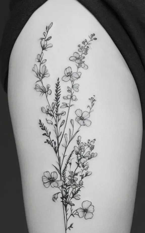 This tattoo is a great option for those wanting to connect with nature. The combination of ferns and wildflowers symbolizes growth, resilience, and harmony. This design feels calming and grounded, perfect for someone who wants a reminder of the beauty found in simplicity.