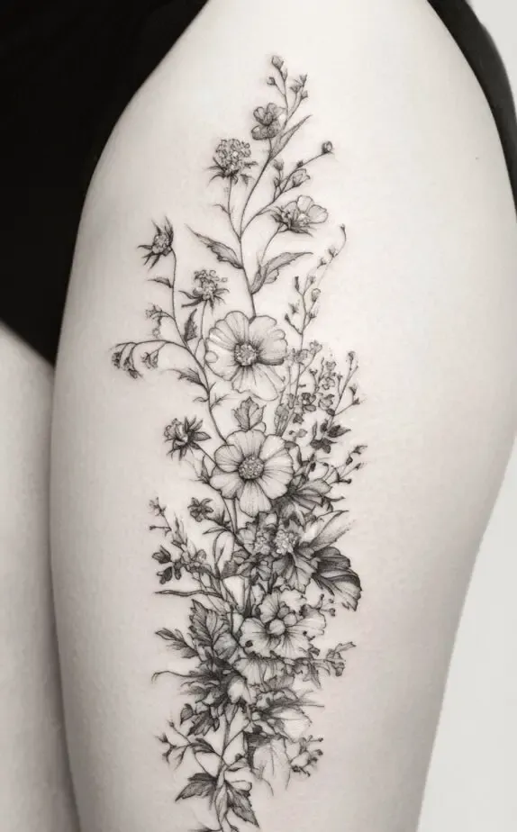 This tattoo resembles a wild garden growing across the hip, with delicate flowers and leaves creating a natural, whimsical look. Each flower seems to reach out, capturing a wild essence that s both charming and unrestrained. The design works seamlessly with the body s contours, making it appear as if the flowers are blooming from within.