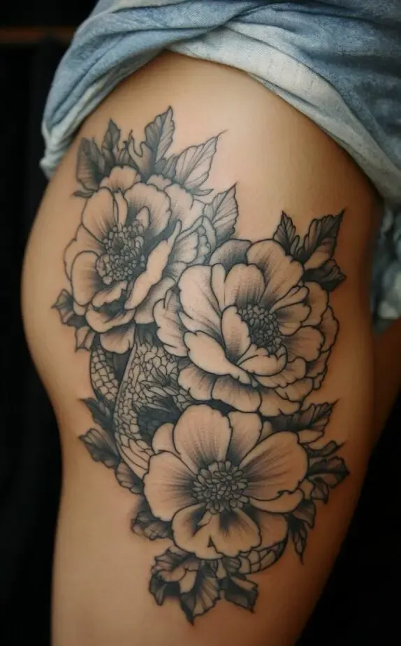 This tattoo showcases peonies, a flower often associated with beauty and romance, gracefully placed along the hip. Each peony is detailed with intricate shading, capturing the layers of petals and depth of the bloom. This placement accentuates the natural curves, adding a gentle flow to the design.