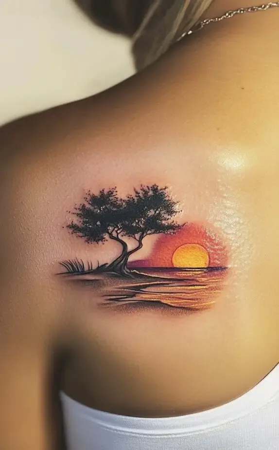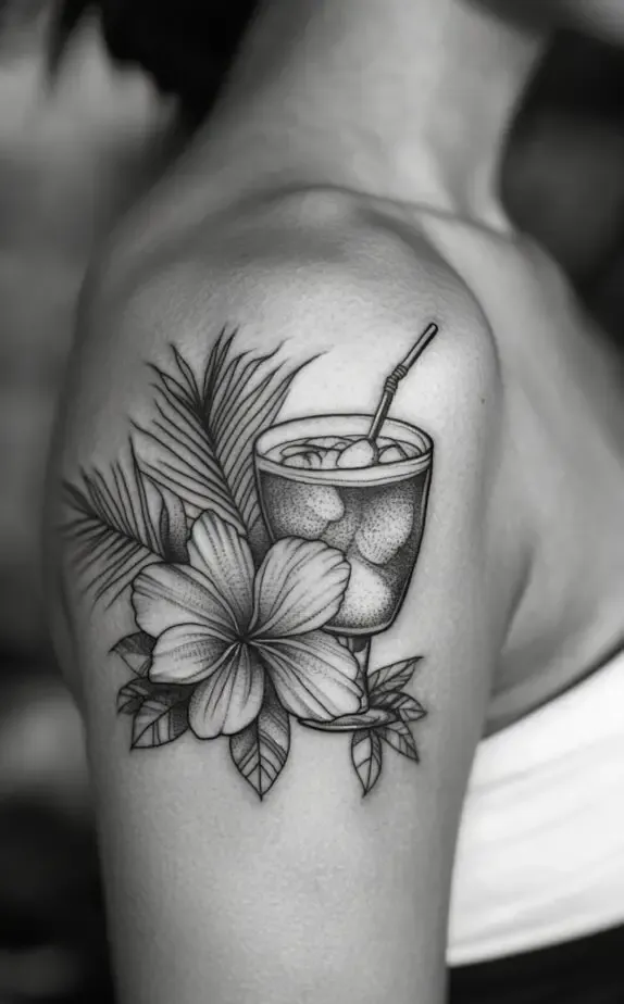 This tattoo combines tropical floral elements with a cocktail glass, adding a fun and unique twist to traditional shoulder tattoos. The detailed hibiscus flower and palm leaves give a sense of the tropics, while the cocktail adds a playful vibe. This design is perfect for those who want a tattoo that reflects a love for travel and relaxation.