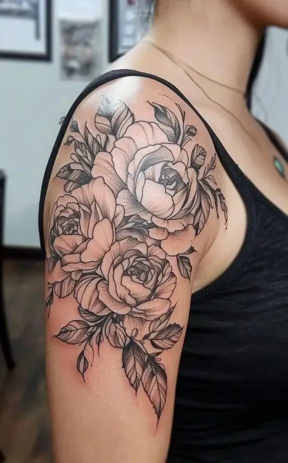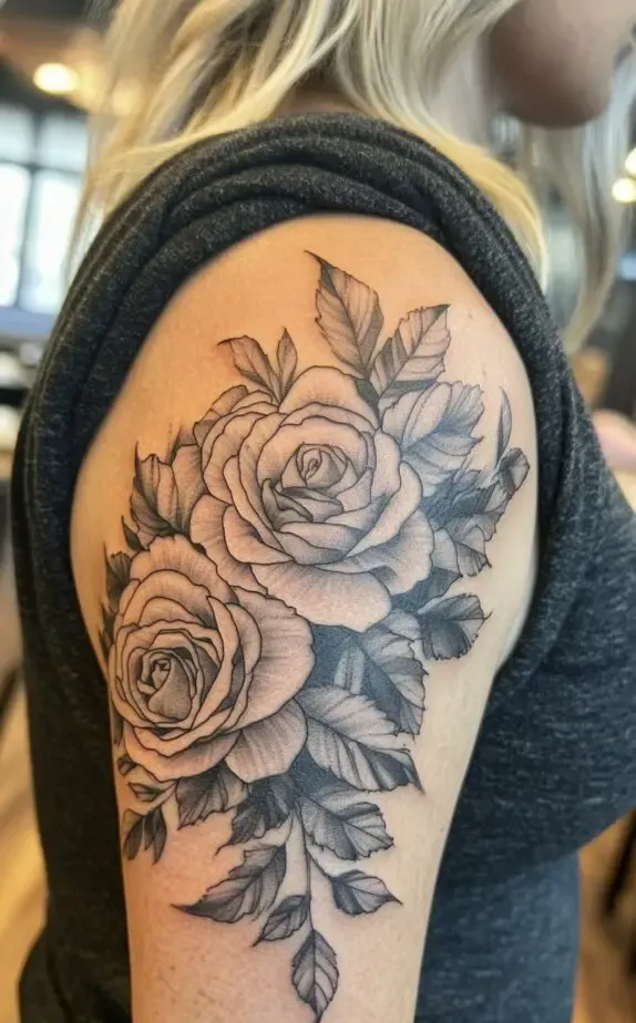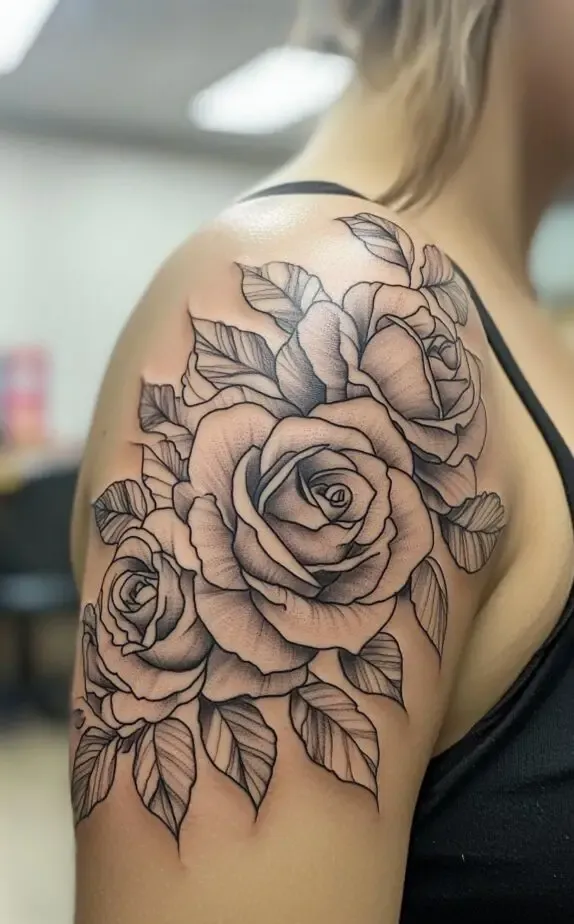 Roses are a timeless choice for tattoos, symbolizing love, beauty, and passion. This tattoo features a cluster of roses on the shoulder, with each bloom meticulously detailed. The shading within each petal gives the roses a realistic, three-dimensional look, making them appear soft and lifelike.