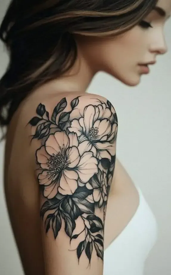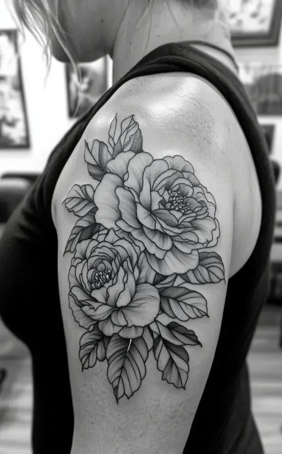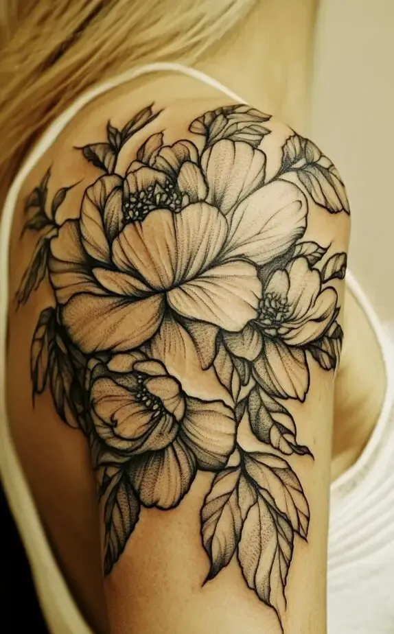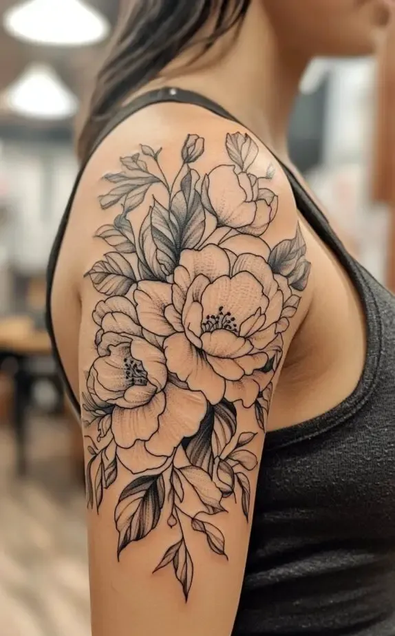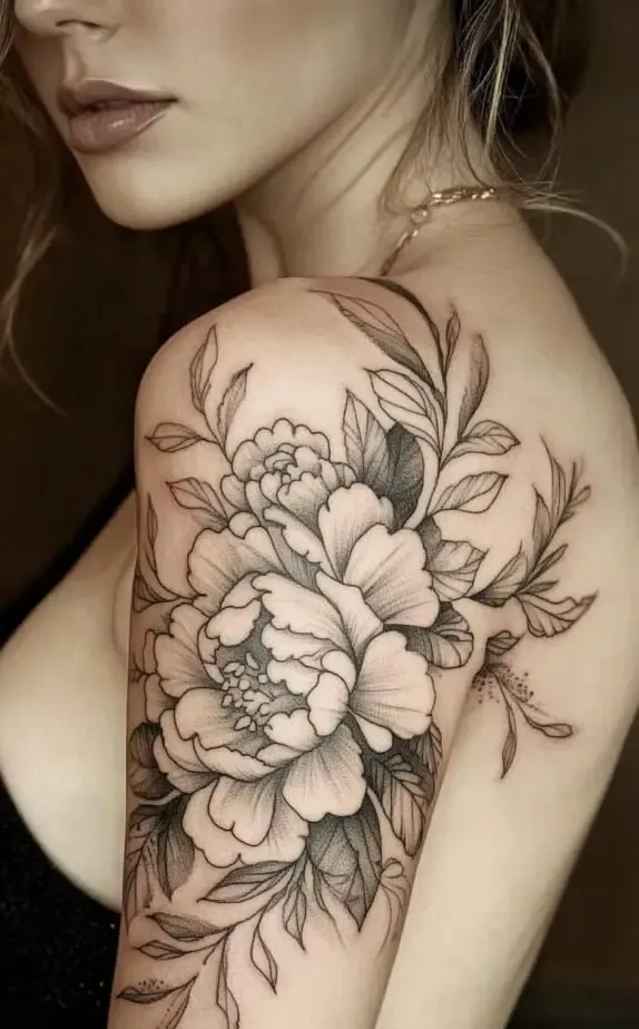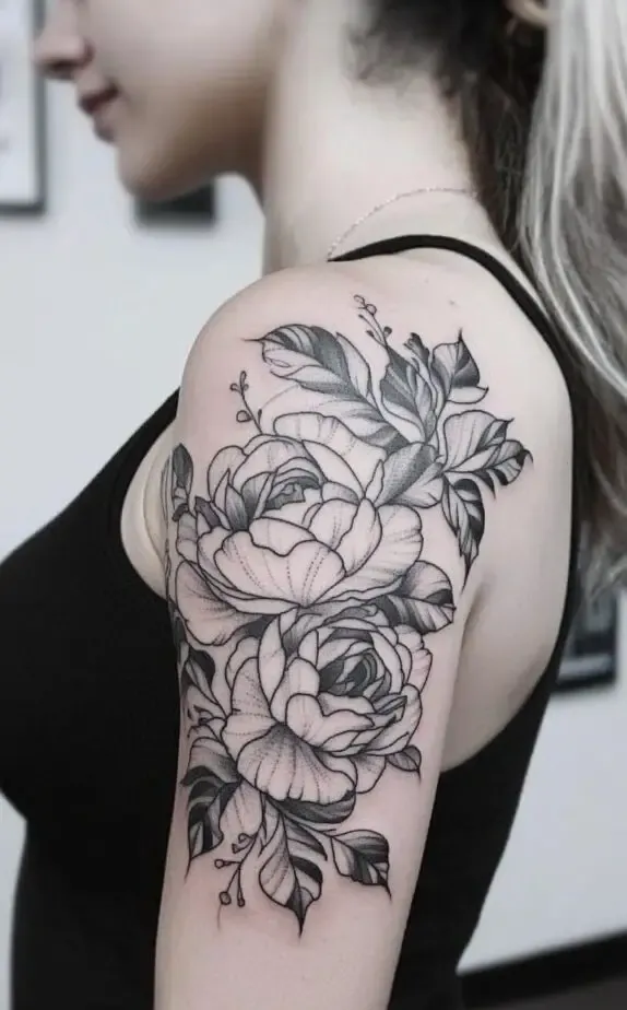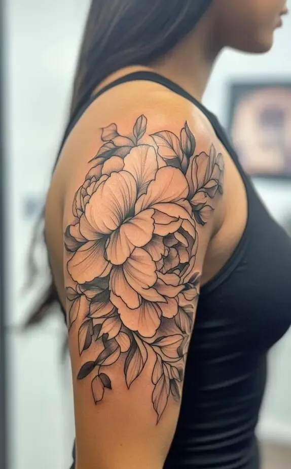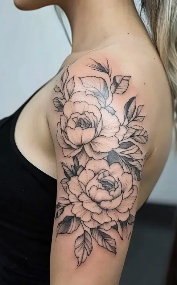 This tattoo showcases a peony-inspired floral design, with full, lush blooms that exude femininity and elegance. The flowers soft shading contrasts beautifully with the bold outlines, adding a touch of realism. The large flowers create a dramatic effect that captures attention without overpowering the shoulder.