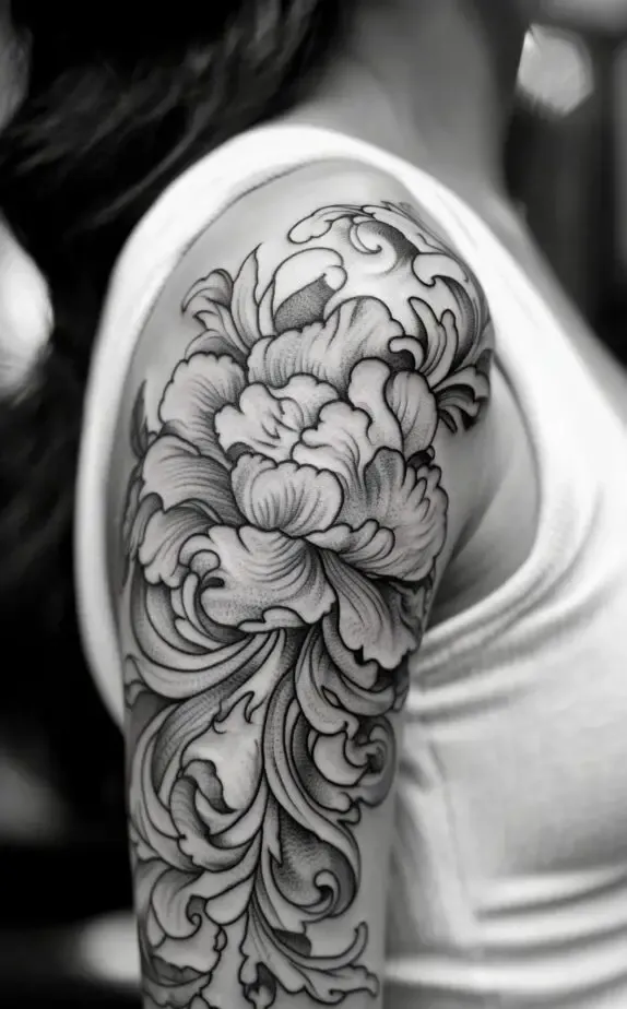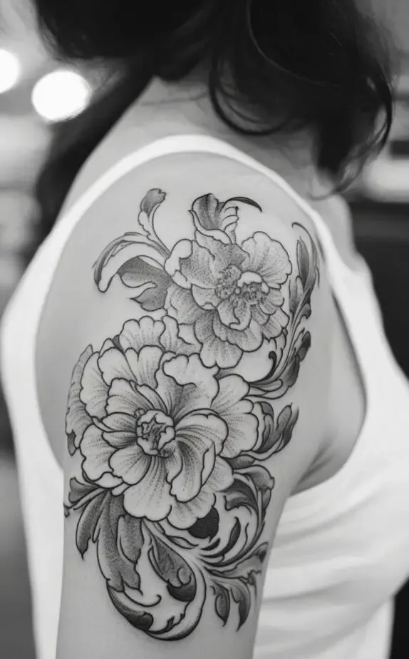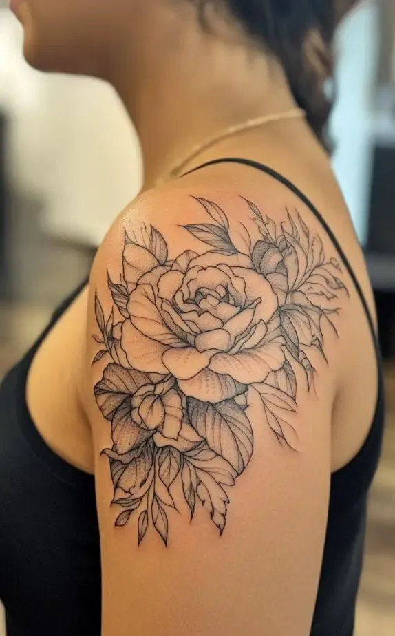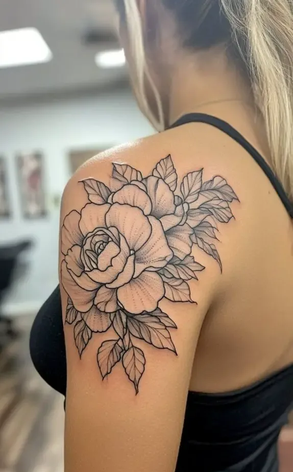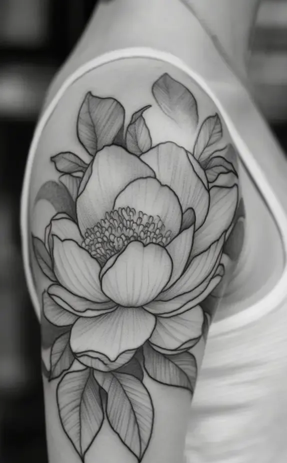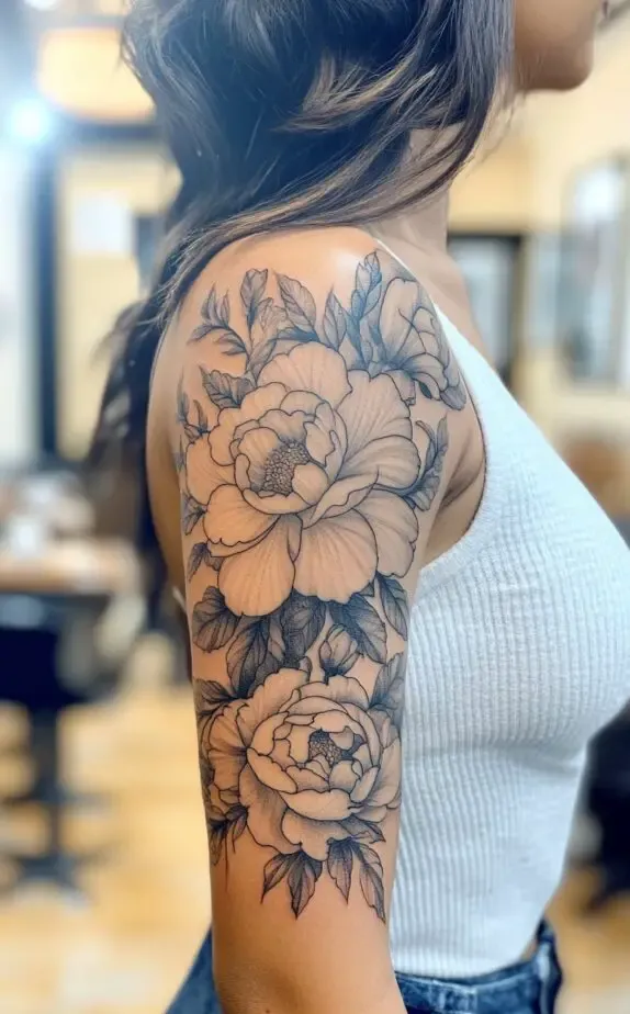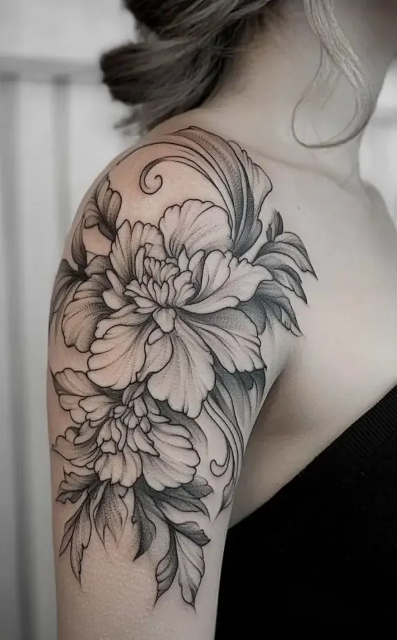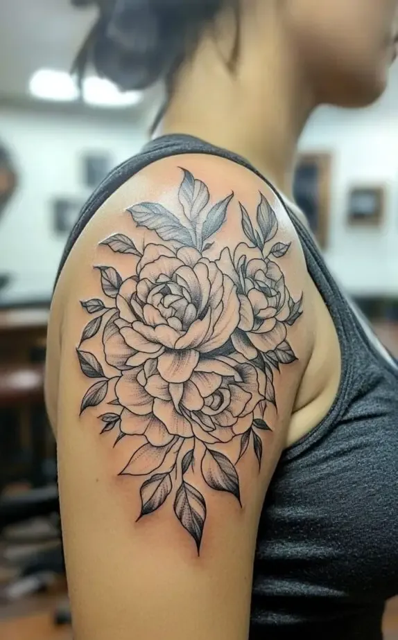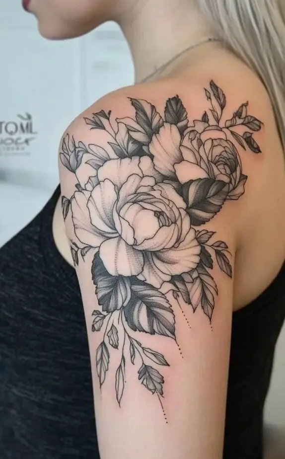 This tattoo showcases a peony-inspired floral design, with full, lush blooms that exude femininity and elegance. The flowers soft shading contrasts beautifully with the bold outlines, adding a touch of realism. The large flowers create a dramatic effect that captures attention without overpowering the shoulder.