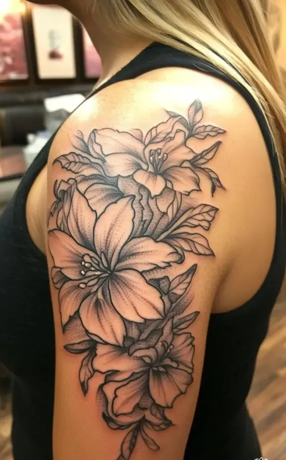 The placement on the shoulder allows the flowers to follow the natural shape of the arm, creating a flowing and harmonious look. The black and gray ink adds a classic touch, making this tattoo a timeless piece that pairs well with any outfit. It s an ideal choice for those who appreciate floral designs that stand out.