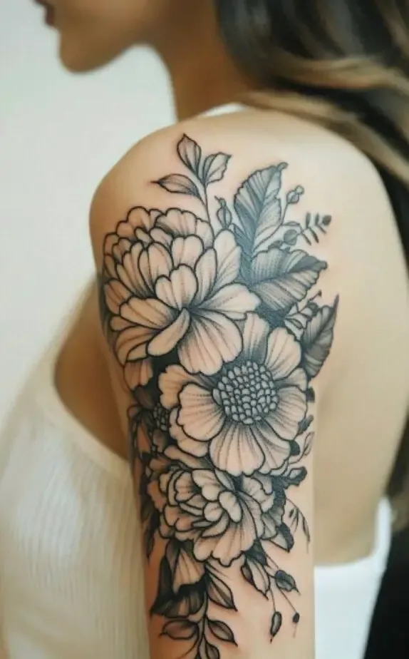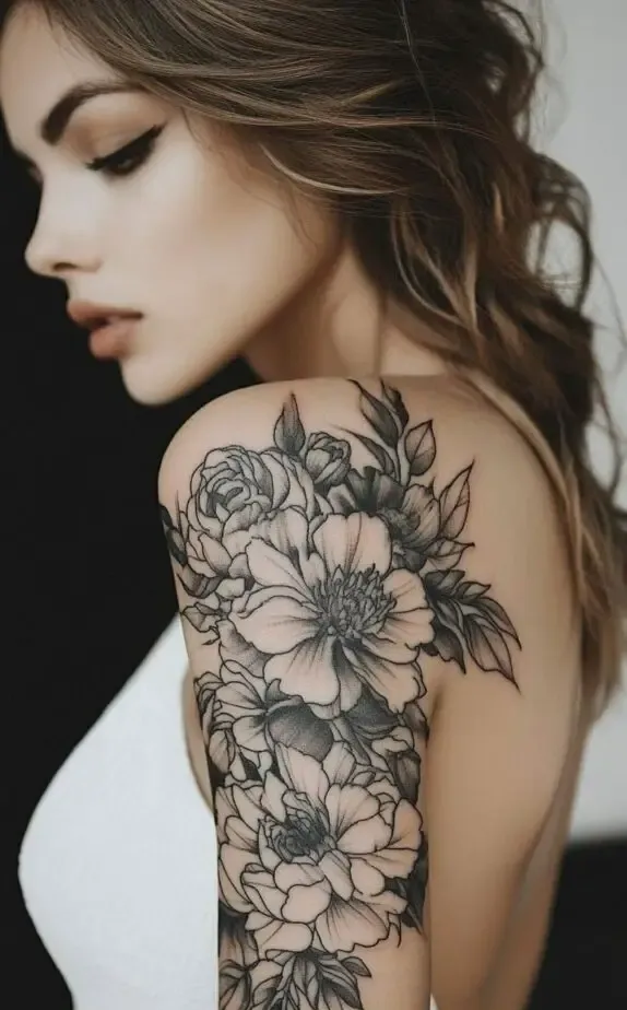This tattoo design showcases a bold, layered arrangement of flowers, covering a larger portion of the shoulder and upper arm. The intricate detailing on each petal and leaf adds depth, making the tattoo appear almost lifelike. This style is ideal for women looking to make a statement with a detailed, eye-catching piece.