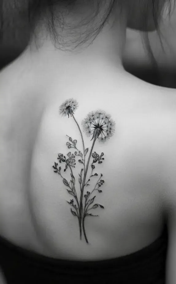 Placed on the shoulder blade, this tattoo sits gracefully, complementing the natural curve of the back. The dandelion represents freedom and new beginnings, making it an ideal choice for those who value simplicity and a deeper meaning in their body art. Its understated elegance makes it suitable for any style.