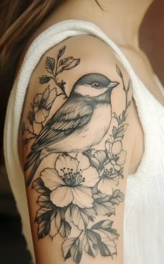 The tattoo is intricately detailed, with shading that adds depth to both the bird and the flowers. The design feels light and airy, ideal for someone who wants to convey a sense of freedom and elegance. This tattoo is perfect for nature lovers and those who want a piece that combines both floral beauty and symbolic meaning.