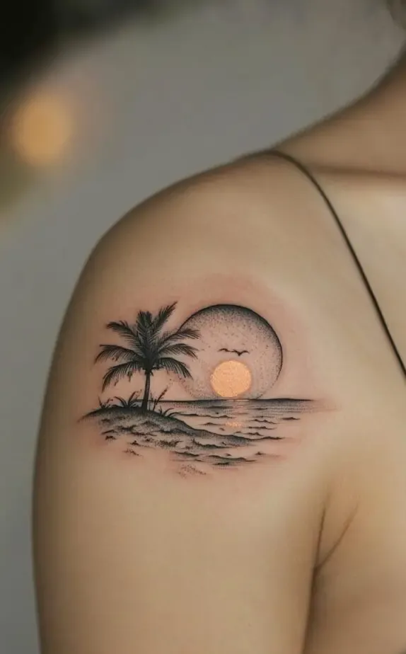 The placement on the shoulder makes this tattoo a standout piece, perfect for summer or beach-themed outfits. The shading and linework enhance the details, making each element stand out. This tattoo is ideal for someone seeking a lively and unique shoulder piece.