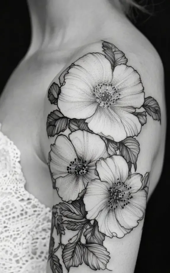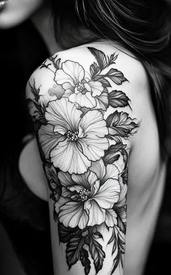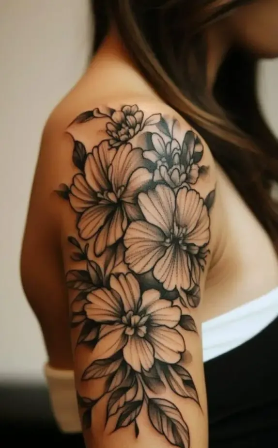 This tattoo features a bold floral cluster with detailed leaves that extend along the shoulder and upper arm. The flowers are large and intricately shaded, giving the design depth and a lifelike quality. This tattoo is perfect for someone looking for a prominent, eye-catching piece that remains elegant and feminine.