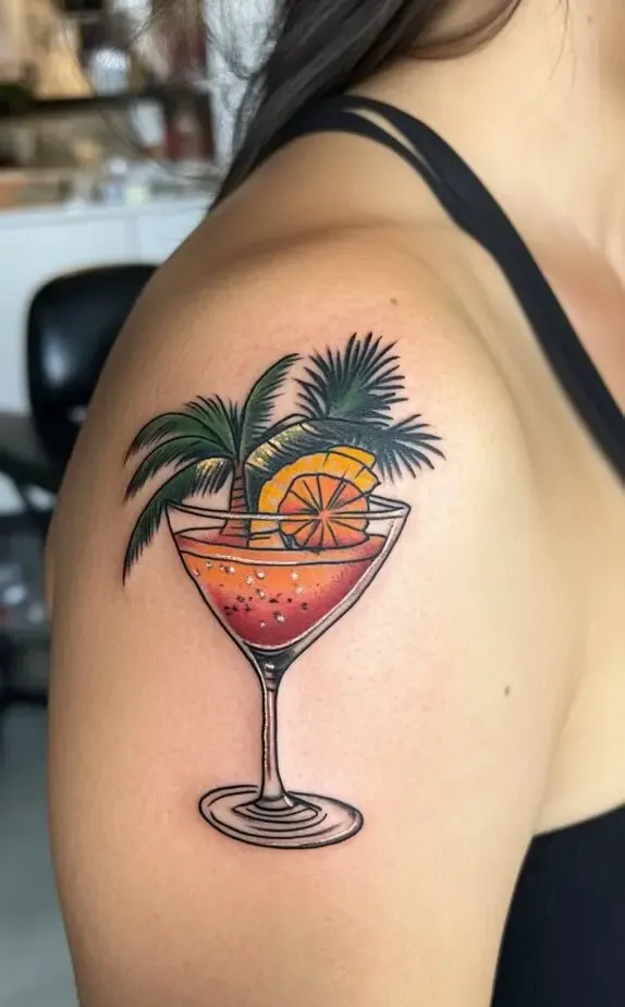 This tattoo features a colorful tropical drink in a glass, complete with palm leaves and a slice of orange, capturing a carefree, vacation-inspired vibe. The bright colors make this tattoo stand out, adding a fun and vibrant touch to the shoulder. It s perfect for someone who loves the tropical aesthetic.