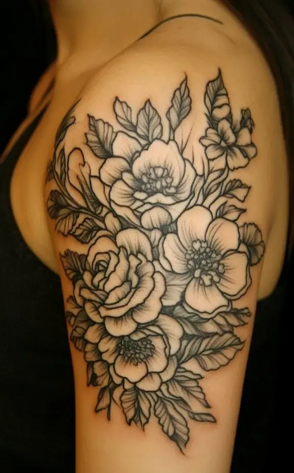 This floral tattoo covers the shoulder and upper arm with a beautifully balanced arrangement of blooms. The use of fine linework and shading brings out the delicate details of each petal and leaf, adding a touch of realism. This design is perfect for those who prefer classic, elegant tattoos with a feminine flair.