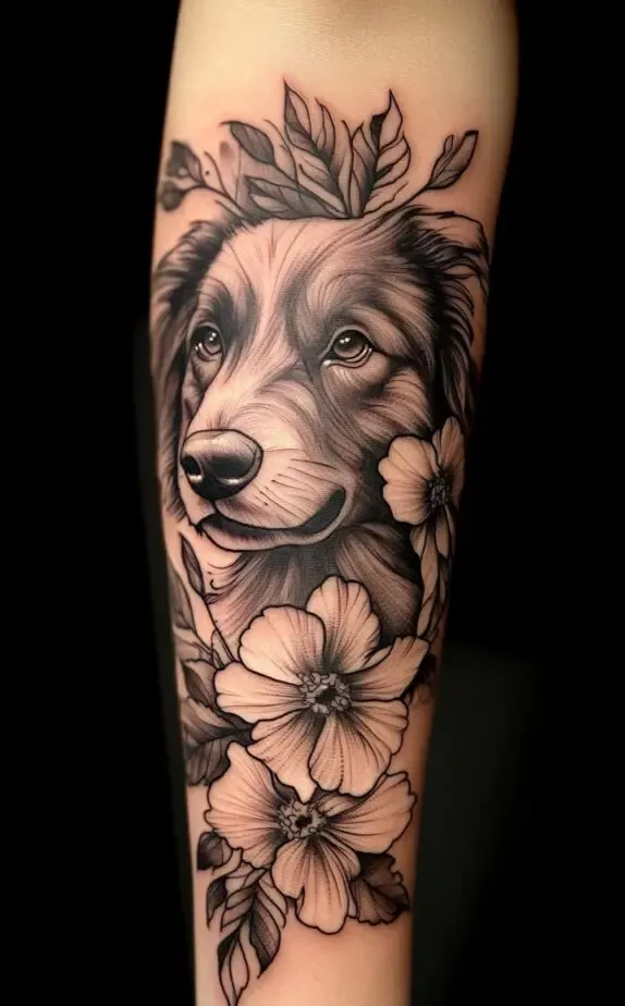 The flowers add a natural, elegant feel to the design, balancing the strong emotional symbolism of the dog portrait. This tattoo is ideal for those who want a personal and meaningful design that celebrates their bond with their pet in a sophisticated way.
