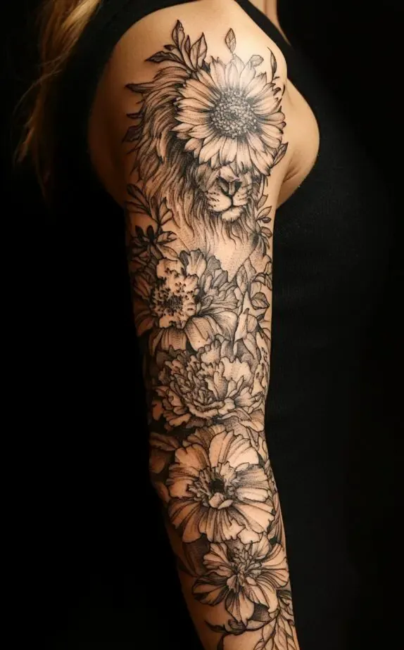 This powerful sleeve design combines the majesty of a lion with a crown of flowers. The lion symbolizes courage and strength, while the flowers add a touch of softness and elegance. It s a beautiful balance between fierce and feminine elements, making it a perfect choice for those who embody both qualities.