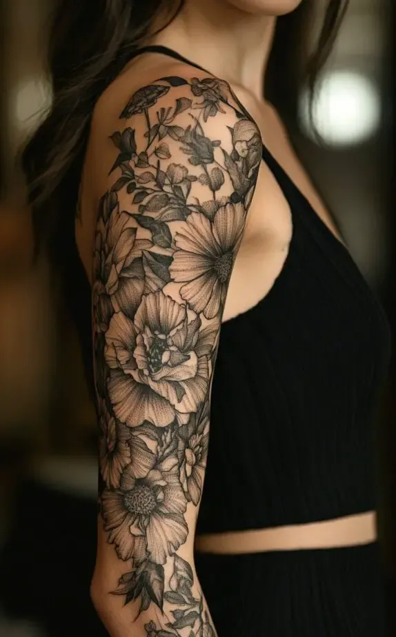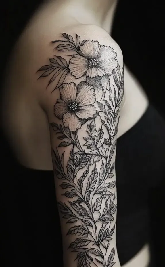 This sleeve is perfect for women who want a tattoo that makes a statement. The bold flowers symbolize strength and beauty, while the leaves add a touch of natural elegance. It s a wonderful choice for anyone looking for a floral design with impact.