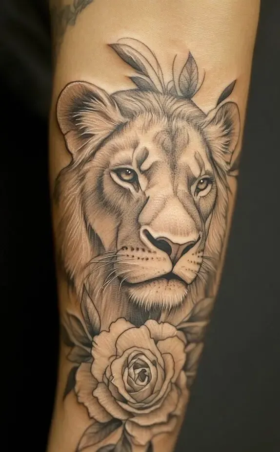 Combining the majestic lion with a rose, this tattoo represents strength and beauty. The lion s face is rendered with realistic detail, capturing its fierce yet calm expression. Below, a beautifully shaded rose adds a touch of elegance, balancing the lion s intensity.
