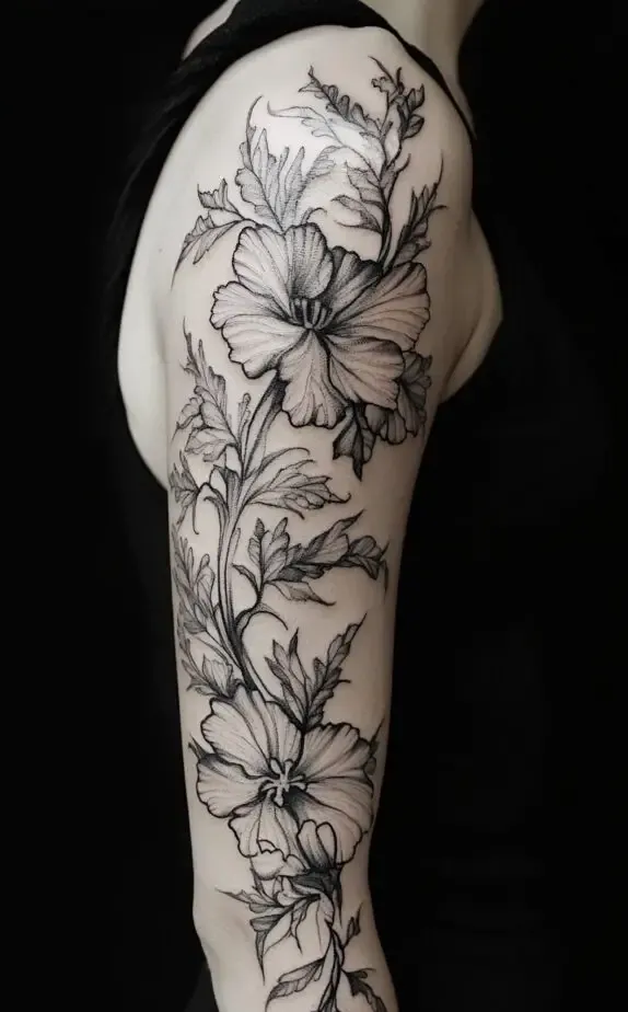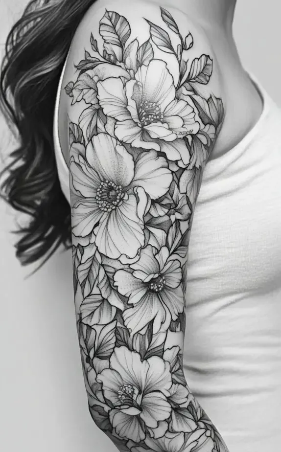 This sleeve combines large, open blooms with delicate foliage, creating a harmonious balance between boldness and subtlety. The flowers are beautifully detailed, with intricate line work and shading that add dimension and depth. It s a celebration of nature s beauty, rendered in a sophisticated black-and-gray style.