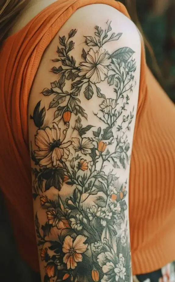 A wildflower sleeve captures the delicate beauty of nature in a way that feels effortless and free. This design features slender branches adorned with small blossoms and leaves, creating a flowing effect. It s a graceful choice for someone who prefers a subtle yet detailed approach to floral tattoos.