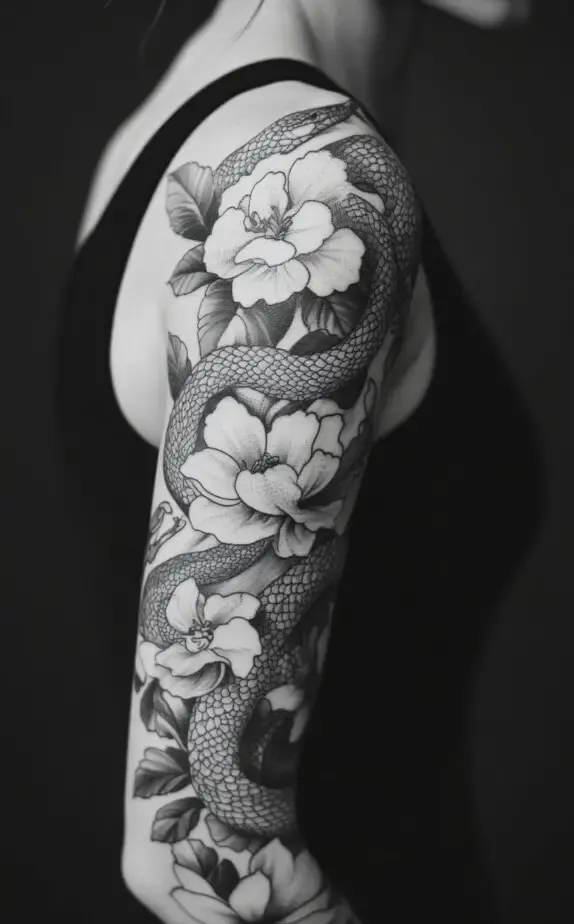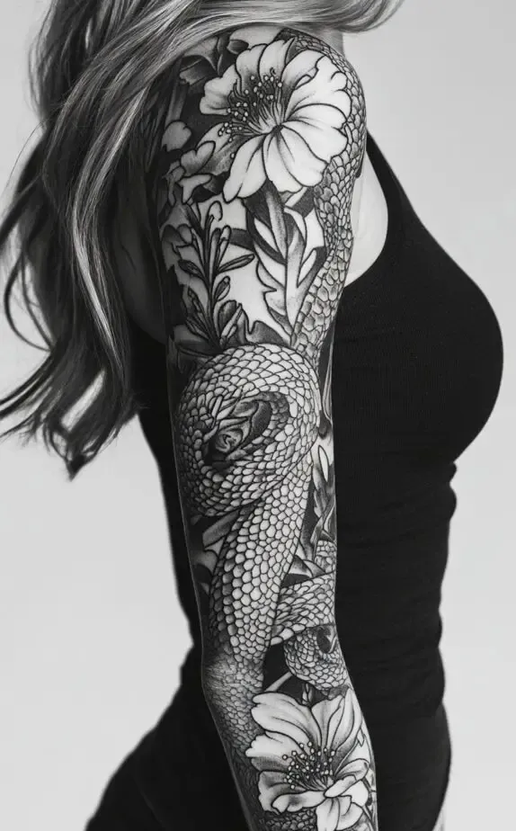This sleeve is an exquisite blend of large, blooming flowers arranged along the arm, each petal shaded to perfection. The monochromatic design enhances the intricate details, creating a sense of unity and flow across the arm. It s ideal for women who appreciate the beauty of flowers but want something bold and cohesive.