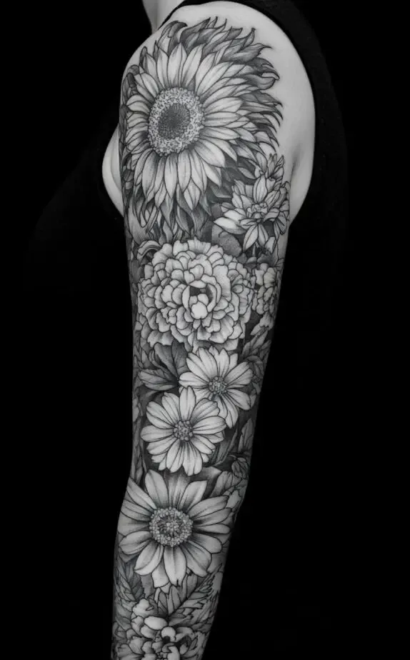 This full sleeve design features a range of flowers, with a prominent sunflower taking center stage. The sunflower, surrounded by other blooms, symbolizes positivity and warmth, making it a cheerful and vibrant choice. The intricate details make each flower stand out, creating a stunning overall effect.