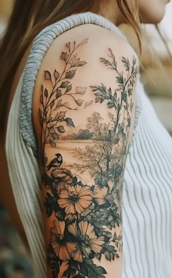 This sleeve tattoo captures a serene nature scene, complete with a bird perched among wildflowers and branches. The artistry brings a sense of tranquility and connection to nature, perfect for those who find peace in the outdoors. The bird symbolizes freedom and perspective, adding a personal touch to this design.