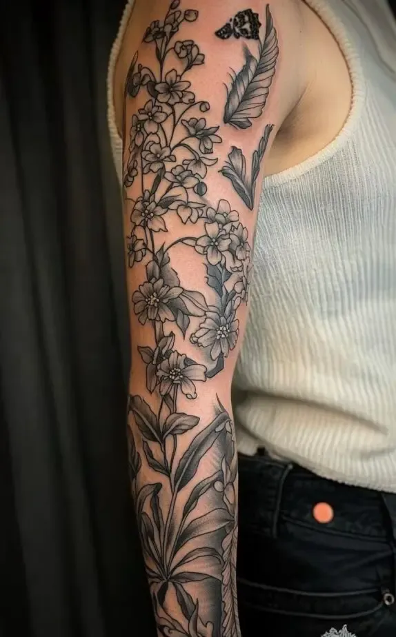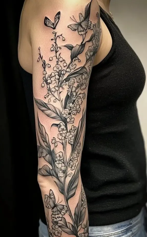The Lily of the Valley symbolizes purity and happiness, making it a thoughtful choice for a sleeve tattoo. This design also includes butterflies, adding movement and a sense of freedom. The detailed flowers and butterfly wings create an elegant composition along the arm.
