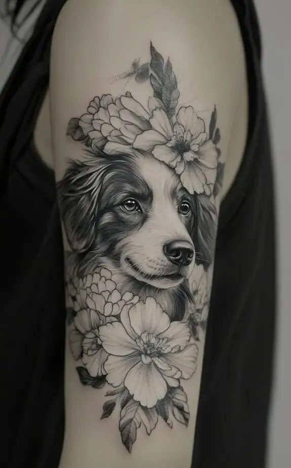 For pet lovers, this tattoo is a beautiful way to honor a cherished companion. The flowers provide a natural frame, making the portrait feel complete and meaningful. This is an excellent option for those who want a tattoo that celebrates the bond between them and their pet.