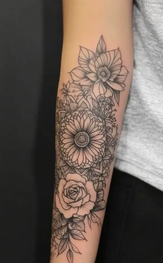 The shading and line work add depth, creating a layered look that feels both natural and sophisticated. This design is ideal for women who want a full sleeve that celebrates the beauty of different flowers, all united by the warm, welcoming symbol of the sunflower.