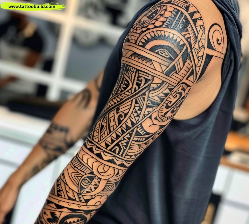 • A traditional Polynesian sleeve incorporating symbols of protection, strength, and family.