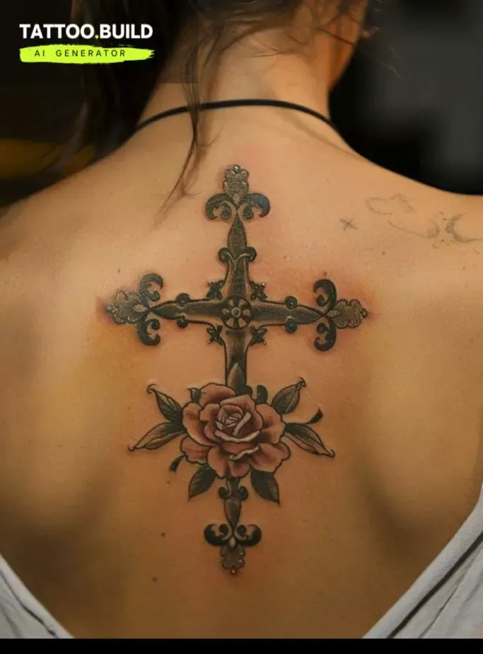 The tattoo displays a combination of religious symbolism through the cross motif, complemented by the natural imagery of the blooming rose, creating an intriguing fusion of contrasting yet harmonious elements.
