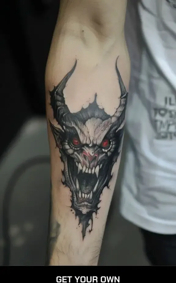 A fragmented demon face tattoo can represent the complexity of human nature, inner conflict, or the duality of good and evil. This design often features hyper-realistic details and intricate shading.