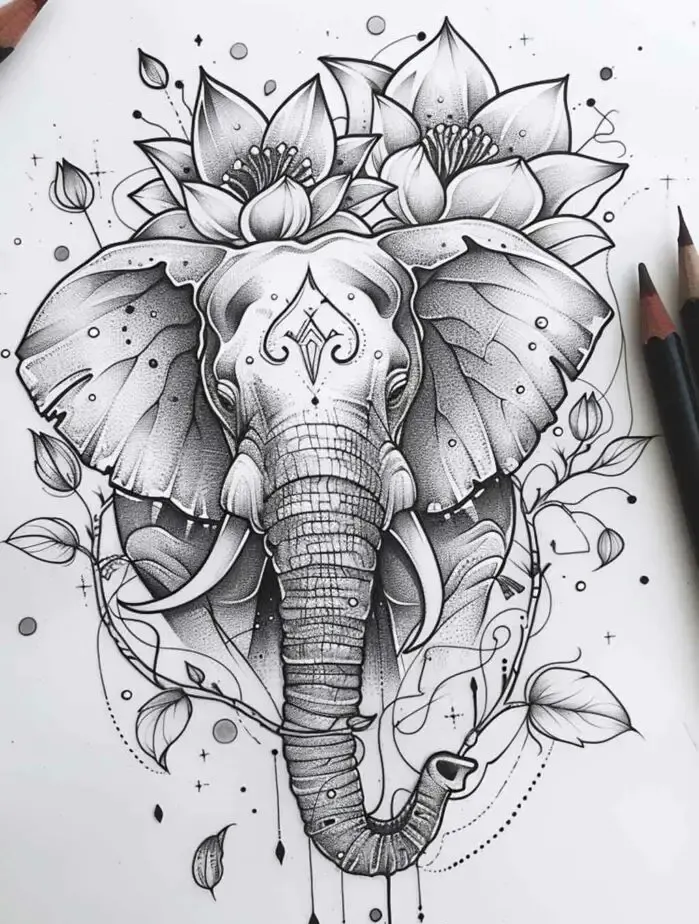 An elephant s head is at the center, detailed with large ears and a long trunk. Surrounding the elephant are bright pink lotus flowers, adding color and vibrancy to the black and gray design.