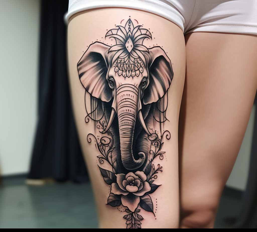 An elephant s head with large, floppy ears and a long trunk sits in the center of a person s thigh. Above its head is a decorative lotus-like flower, and below, a large, detailed rose.