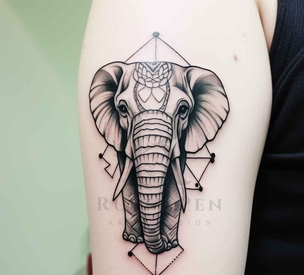 This tattoo shows the front view of an elephant s head centered on a person s leg. Similar to the previous design, this one is also rich in detail, with the elephant s head featuring ornate decorations.