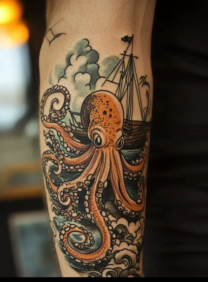 In nautical-themed tattoos, the octopus is often depicted in a classic sailor style. These designs may feature bold lines and vibrant colors, set against a backdrop of waves, anchors, or ships. Traditional nautical tattoos often emphasize the octopus s role as a symbol of the sea.