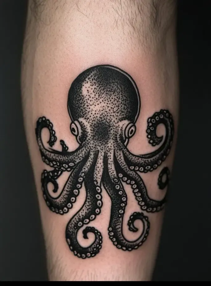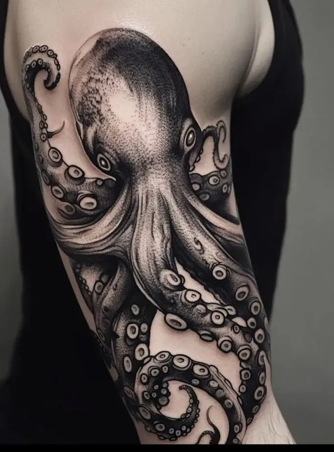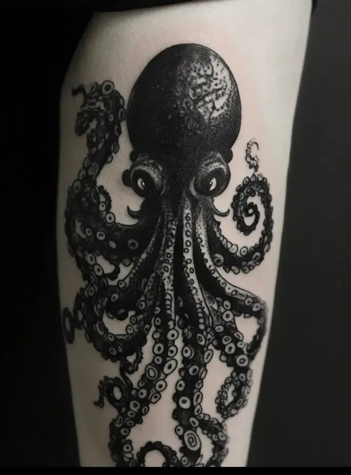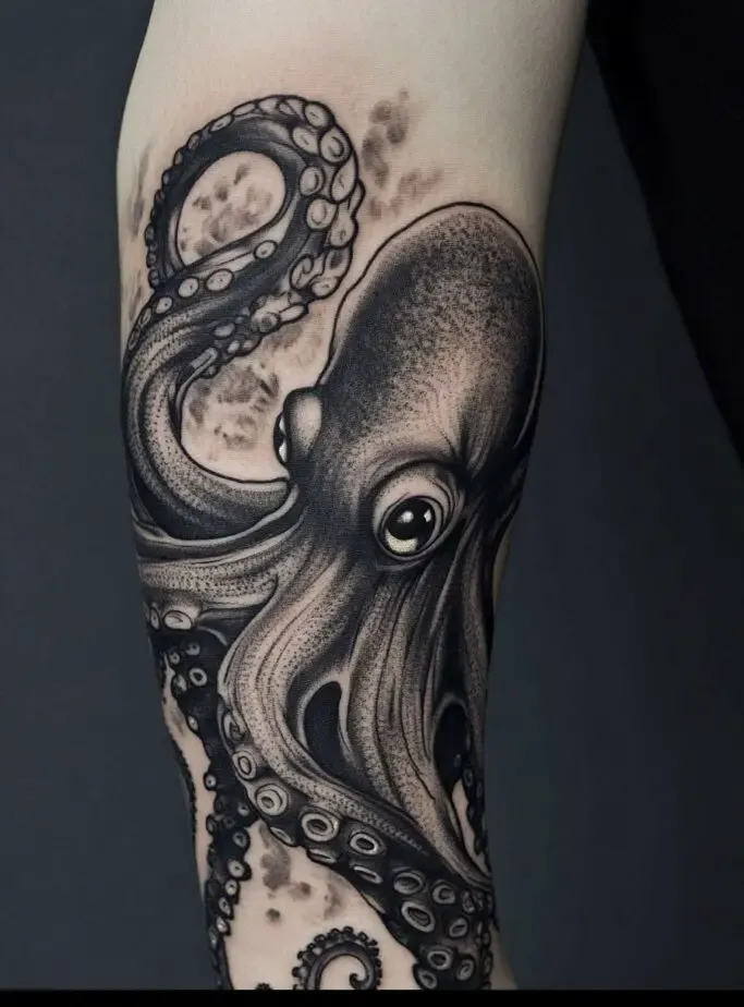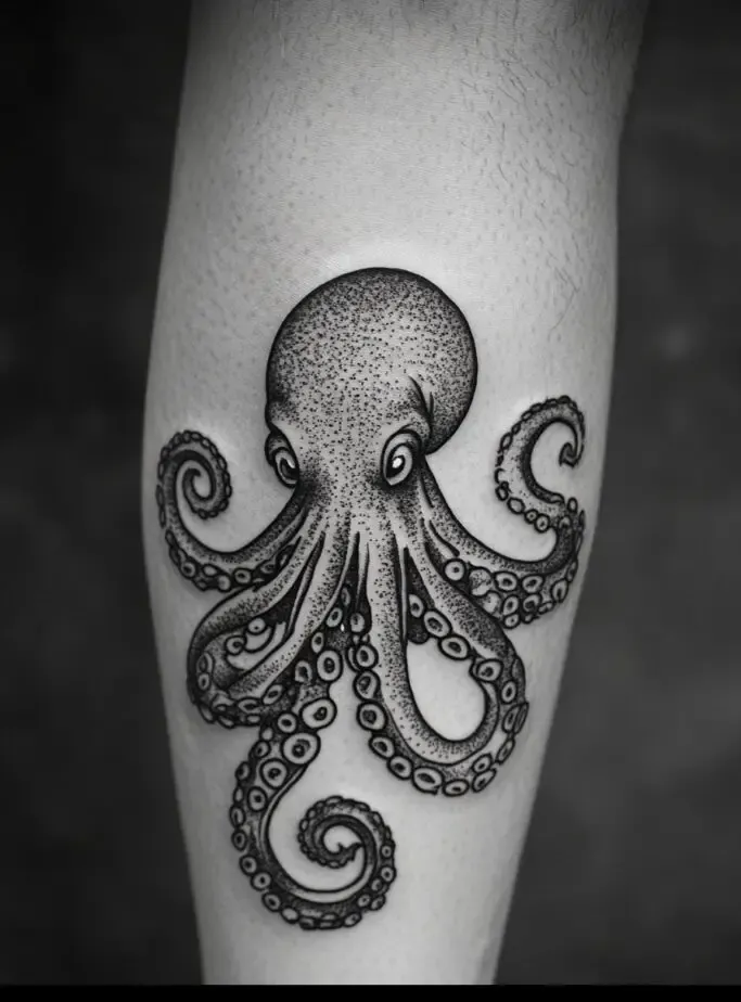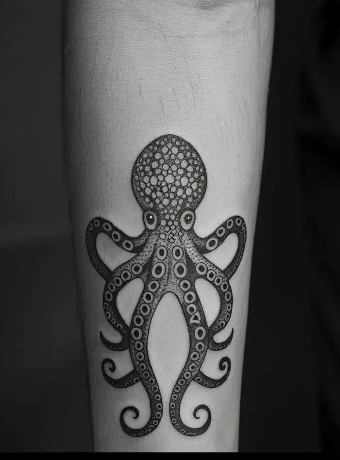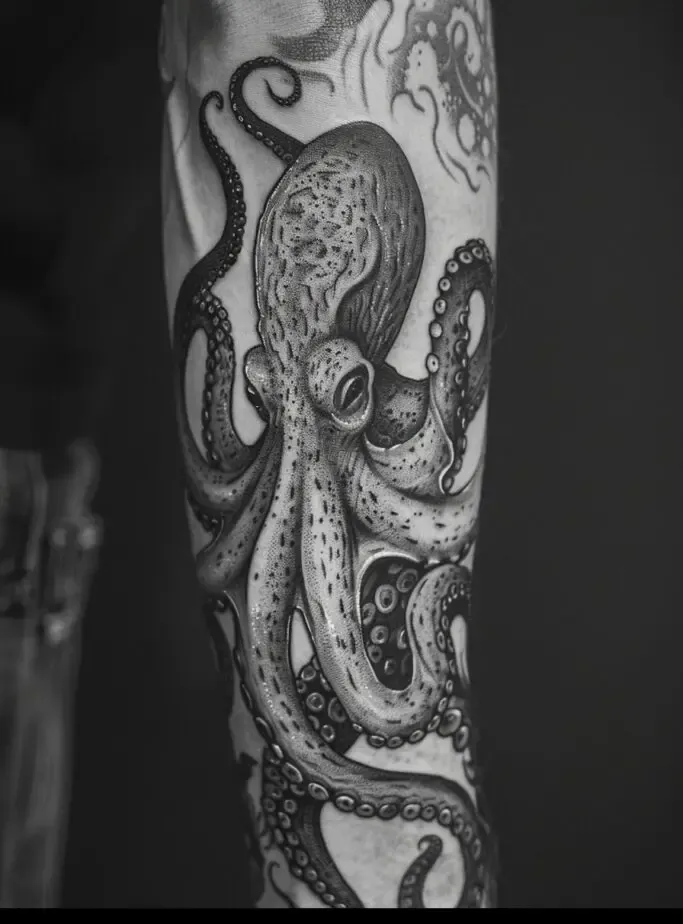 Dotwork tattoos use dots to build up shading and detail, creating a visually striking effect. Blackwork designs focus on solid black ink and heavy contrast, which can give the octopus a bold and dramatic appearance.