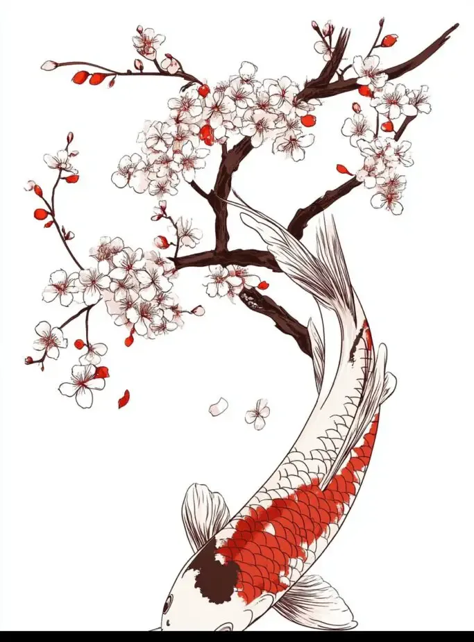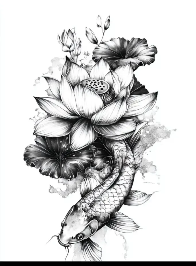 Lotus flowers symbolize purity and enlightenment. When paired with koi fish, they can signify the journey towards spiritual growth and inner peace.