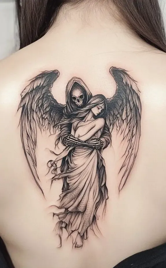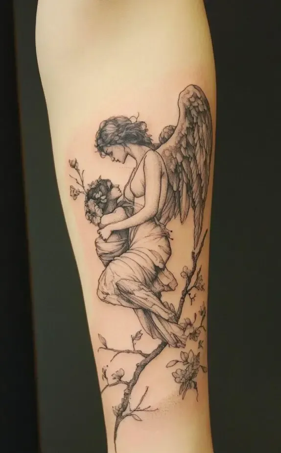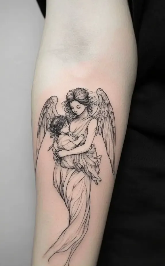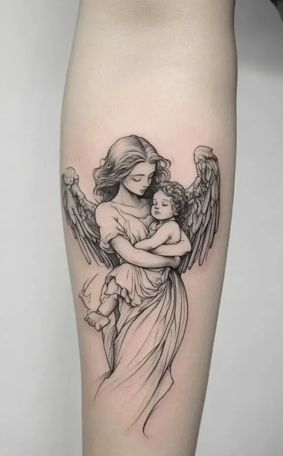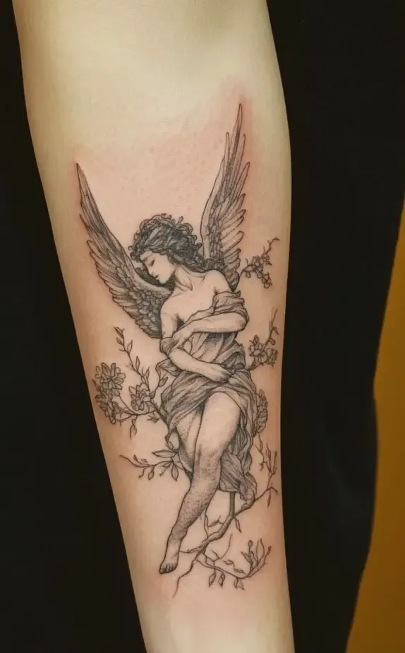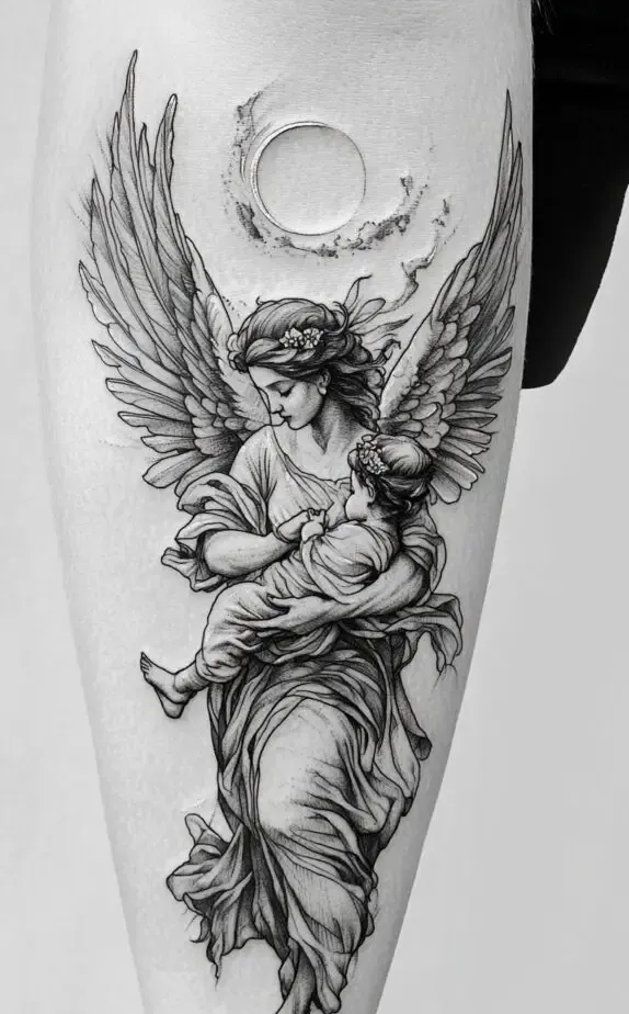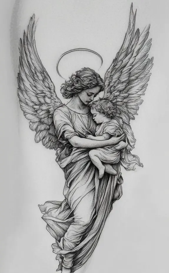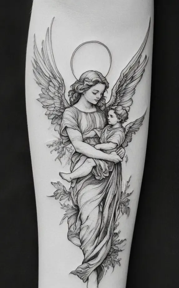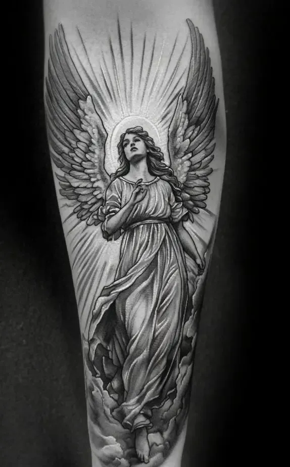 Guardian angel tattoos are often chosen as symbols of protection and guidance. These designs depict angels in protective stances, often with outspread wings and a watchful expression. Guardian angel imagery is popular among those who feel a connection to a loved one who has passed or as a symbol of personal strength. This design style often includes intricate details in the wings, face, and garments, emphasizing the gentle yet powerful nature of these beings.