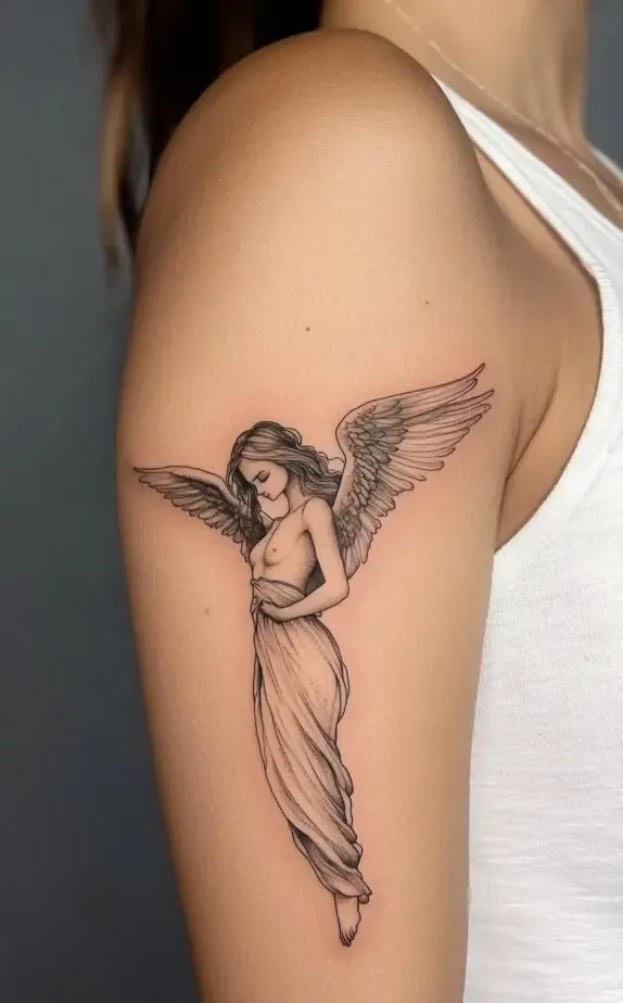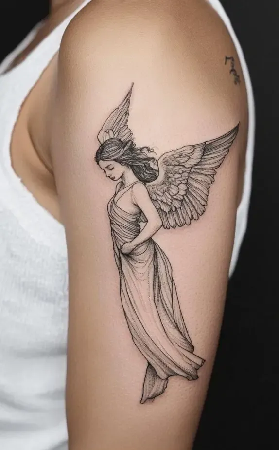 Upper Arm and Shoulder: The upper arm and , particularly for guardian or cherub designs. These areas provide enough space for detailed artwork while allowing the tattoo to be easily covered when desired. Many women choose to have the wings extend toward the shoulder for a graceful, flowing effect.