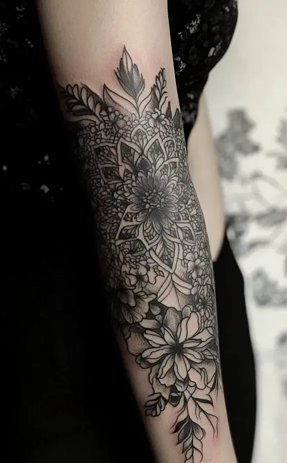 - Henna-Inspired Patterns: Henna designs include intricate, lace-like patterns with floral and geometric shapes. Translating these designs into a black-ink tattoo can create a sophisticated, delicate look, making the arm appear adorned with lace.
