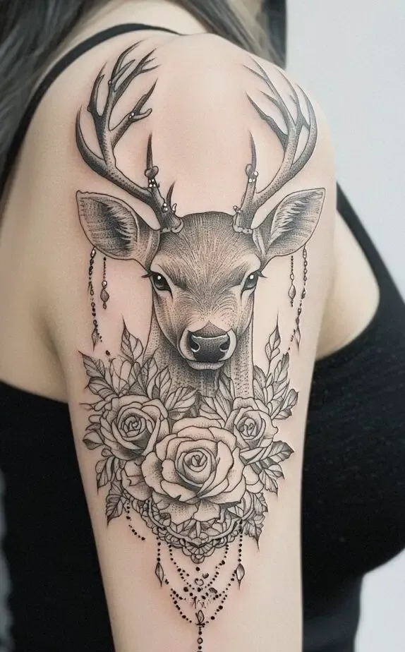 A unique and eye-catching design, this tattoo showcases a graceful deer crowned with antlers decorated in floral motifs. The combination of the deer, flowers, and dangling ornaments adds a mystical quality, perfect for someone wanting an enchanting yet sophisticated look.