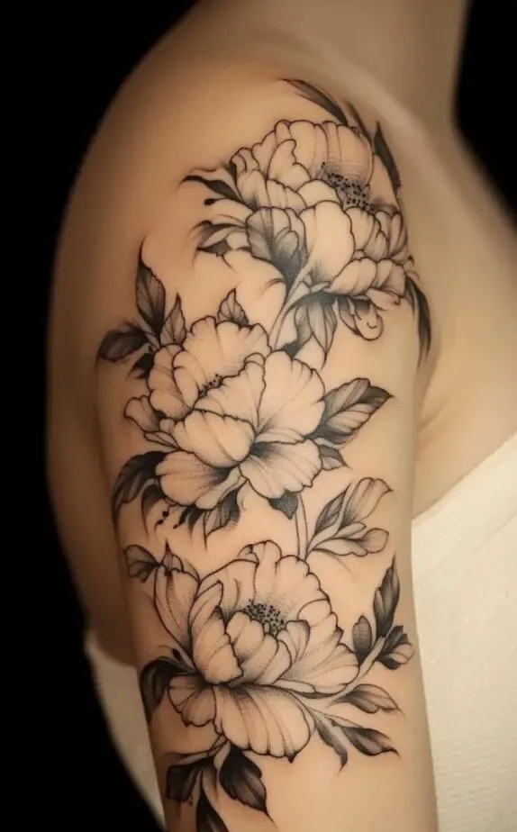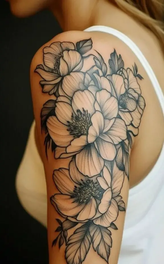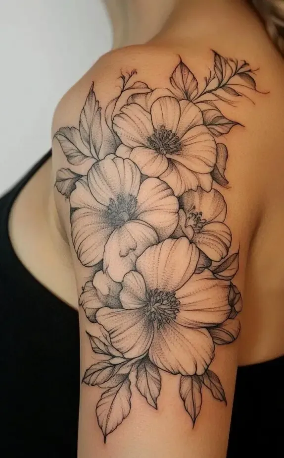 This shoulder tattoo showcases large flowers with subtle shading, capturing the beauty of each petal in exquisite detail. The flowers are arranged in a way that accentuates the natural shape of the shoulder, creating a flattering look. Each bloom is meticulously crafted, adding depth and texture.