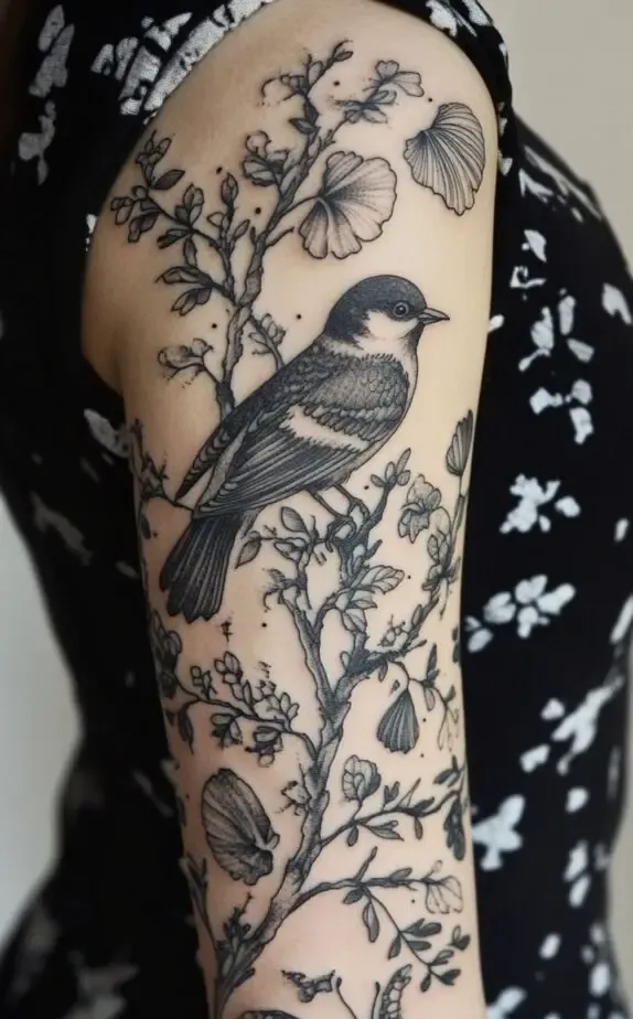 This half-sleeve tattoo features a charming bird perched on delicate branches with scattered blossoms. The intricate shading and line work bring the bird to life, highlighting its feathers and the gentle sway of the branches. This tattoo is ideal for nature lovers who want to capture the beauty of wildlife in a minimalist, elegant form.