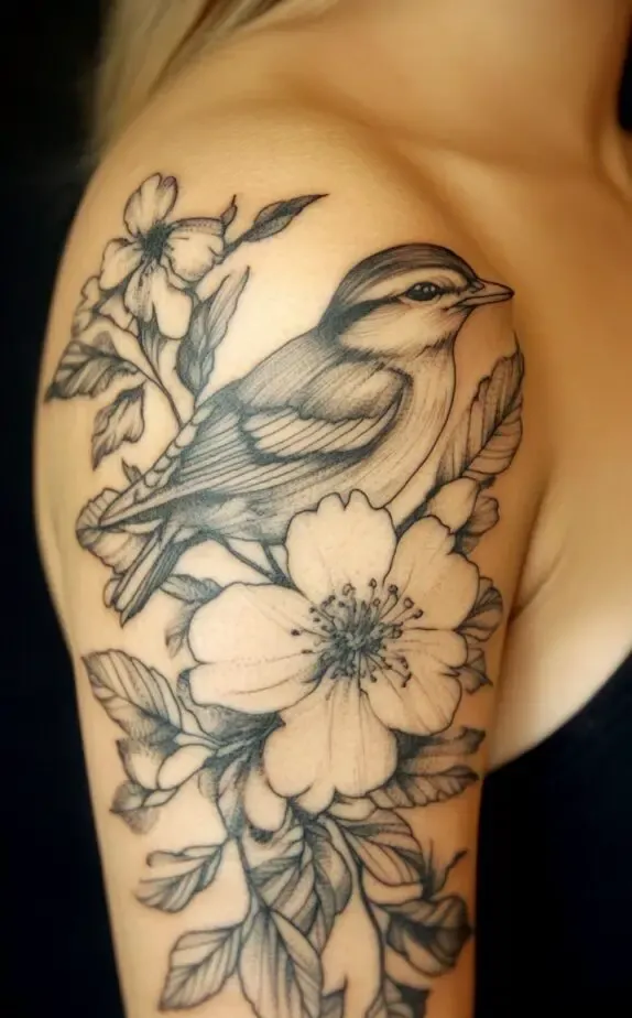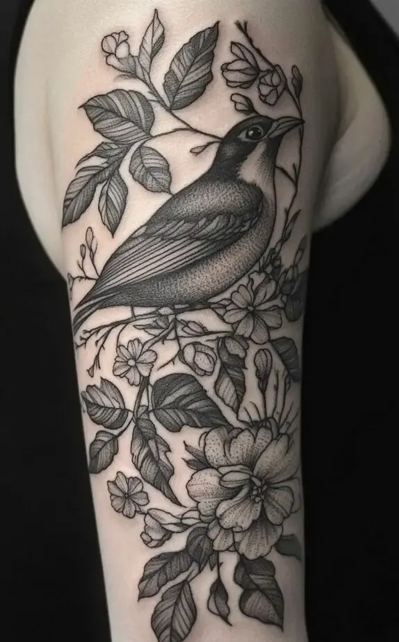 This tattoo features a detailed bird perched among blooming flowers and leaves. The intricate line work and shading give it a lifelike quality, with the bird symbolizing freedom and the flowers adding a touch of femininity. This piece offers a peaceful, harmonious vibe.