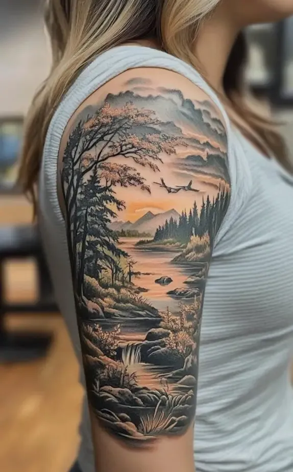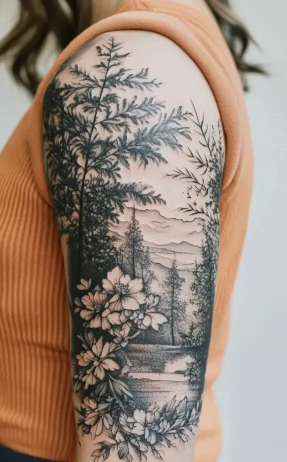 For nature enthusiasts, this tattoo presents a tranquil forest scene with tall trees and distant mountains. The meticulous detail of the foliage creates a realistic look, while the background mountains add depth and perspective. It s a beautiful reminder of the peacefulness and beauty found in nature.
