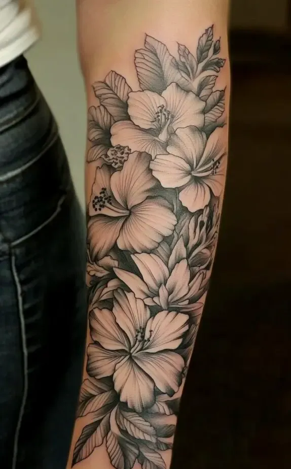 A tropical-inspired tattoo featuring hibiscus flowers and large leaves, this design is bold and captivating. The intricate shading on each petal and leaf creates a rich texture, making the flowers appear full and vibrant. The hibiscus is often associated with beauty and joy, reflecting a positive outlook.