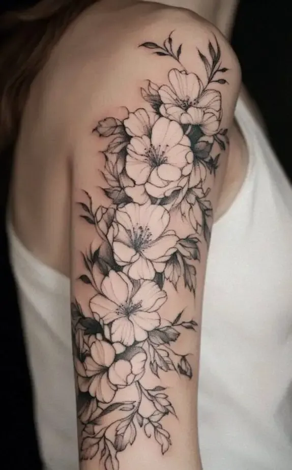 This tattoo showcases a cascade of large, open flowers, flowing down the shoulder and upper arm. The flowers are carefully shaded to bring out their delicate details, giving a sense of depth and movement to the design. The simplicity of black ink highlights the petals textures, creating a soft yet eye-catching effect.